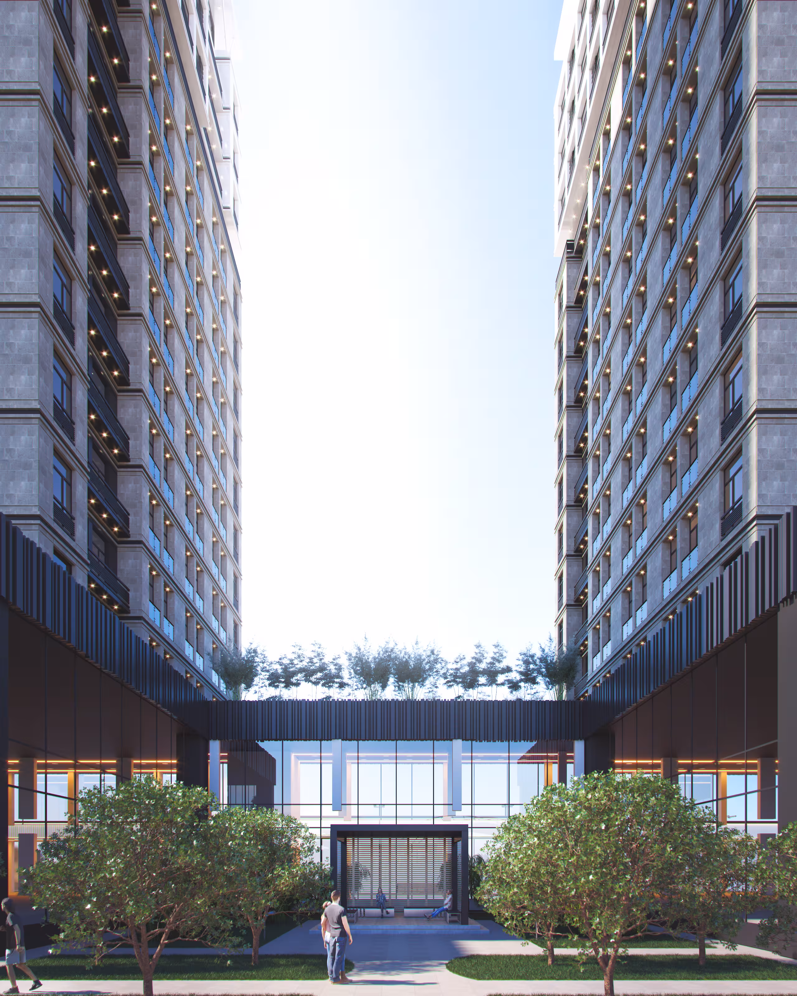Daily essentials, cafés, and services are integrated directly beneath the towers. Life flows vertically — from home to street-level activity — without traffic, detours, or wasted time.